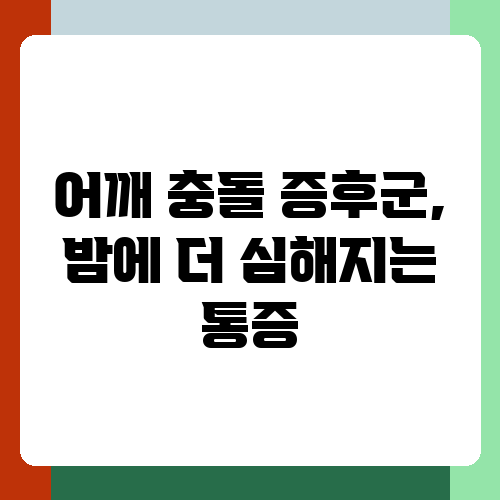 어깨 충돌 증후군은 팔을 들어 올릴 때 어깨뼈와 힘줄 사이의 공간이 좁아지면서 힘줄이 눌리는 질환입니다. 팔을 움직일 때 심한 통증이 나타나고, 밤에 통증이 더 심해지는 특징이 있다고 합니다. 야구 투수나 테니스 선수처럼 어깨를 많이 사용하는 사람들에게 흔하게 나타난다고 해요. 이 증상 또한 초기에는 약물치료나 물리치료로 증상 완화가 가능하며, 심한 경우에는 수술적 치료가 필요할 수도 있습니다. 저는 어깨 충돌 증후군 환자분들 중에 밤에 통증 때문에 잠을 제대로 못 주무시는 분들이 많다는 것을 알게 되었어요. 따라서 밤에 통증이 심하다면, 반드시 전문의와 상담하시는 것이 중요합니다.