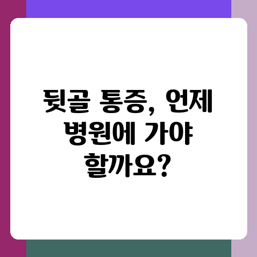만약 뒷골 통증이 심하거나, 통증과 함께 다른 증상 (두통, 어깨 통증, 팔 저림 등)이 동반된다면 즉시 병원을 방문해야 합니다. 또한, 휴식이나 스트레칭 등의 자가 치료에도 불구하고 통증이 호전되지 않으면 전문의의 진료를 받는 것이 좋습니다. 단순한 근육통인지, 경추 이상으로 인한 통증인지 정확한 진단을 받아야 적절한 치료를 받을 수 있습니다. 저는 몇 주 동안 자가 치료를 시도했지만, 통증이 나아지지 않아 결국 병원을 찾았답니다. 다행히 조기에 치료를 시작해서 지금은 많이 호전되었어요. 자신의 몸 상태를 잘 살피고, 필요하다면 주저하지 말고 전문가의 도움을 받으세요.
