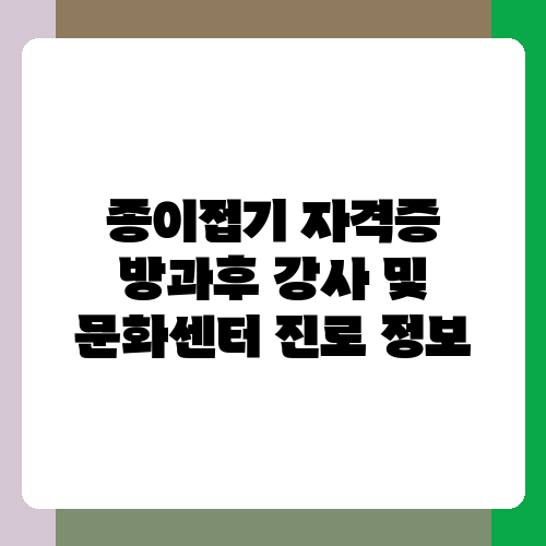 종이접기 자격증을 취득하고 방과후 강사나 문화센터 강사로 활동하는 것은 매력적이고 보람 있는 경험이 될 수 있습니다. 하지만 단순히 자격증만으로는 충분하지 않다는 점을 기억하세요. 꾸준한 노력과 전문적인 역량 강화를 통해 자신만의 강점을 만들어 나가는 것이 성공적인 진로를 위한 중요한 요소입니다. 본인의 열정과 노력이 있다면 종이접기 자격증을 통해 꿈을 펼칠 수 있을 거라고 믿습니다. 지금 바로 자신에게 맞는 진로 계획을 세워보세요!