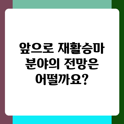 인구 고령화와 함께 장애인 인구가 늘어나고 있는 추세를 고려하면 재활승마 분야의 전망은 밝다고 할 수 있습니다. 재활승마는 단순히 레저 활동이 아닌, 의료 및 재활 분야에서 중요한 역할을 수행하고 있으니까요. 하지만 경쟁이 심화될 가능성도 고려해야 합니다. 차별화된 경쟁력을 갖추기 위해 꾸준한 자기계발과 전문성 향상에 힘써야 합니다. 다양한 자격증 취득이나 추가 교육을 통해 전문성을 높이는 것도 좋은 방법일 거예요.