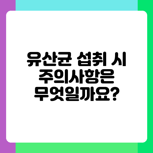 유산균 섭취 시에는 몇 가지 주의사항이 있습니다. 첫째, 유산균은 개인에 따라 효과가 다를 수 있으므로, 자신에게 맞는 제품을 찾는 것이 중요합니다. 둘째, 유산균은 일반적으로 부작용이 적지만, 일부 사람들에게는 복통이나 설사 등의 증상이 나타날 수 있습니다. 증상이 나타나면 섭취를 중단하고 의사와 상담하세요. 셋째, 유산균 제품은 서늘하고 건조한 곳에 보관해야 효능을 유지할 수 있습니다. 마지막으로, 유산균은 약이 아니므로 질병 치료 효과를 기대해서는 안 됩니다. 질병 치료는 반드시 의사의 진료를 받아야 합니다.