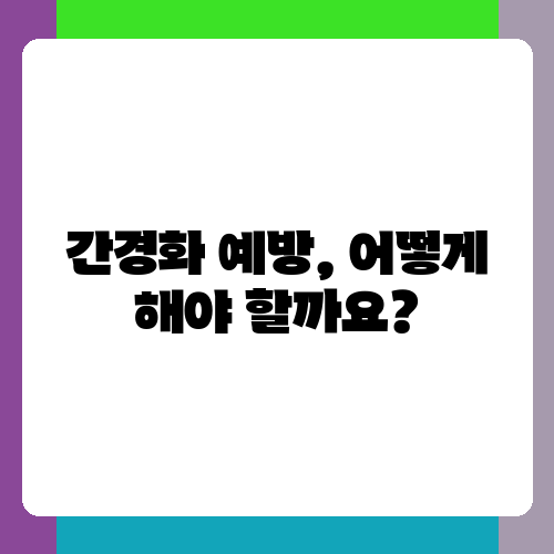 간경화를 예방하기 위해서는 무엇보다 건강한 생활 습관을 유지하는 것이 중요합니다. 과도한 음주는 간에 심각한 손상을 입히므로 절제하는 것이 좋습니다. 또한 고지방, 고칼로리 음식 섭취를 줄이고, 균형 잡힌 식단을 유지하는 것이 중요합니다. 규칙적인 운동과 충분한 수면 역시 간 건강에 도움이 됩니다. 간 건강에 좋은 음식으로는 브로콜리, 시금치, 녹차 등이 있습니다. 스트레스는 간 건강에 악영향을 미치므로 스트레스 관리에도 신경을 써야 합니다. 스트레스 해소 방법으로는 명상, 요가, 취미 활동 등이 있습니다. 평소 간 건강에 대한 관심을 갖고, 정기적인 건강 검진을 통해 간 건강을 체크하는 것이 중요합니다.