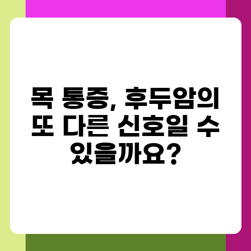 목 통증은 감기나 인후염 등 다양한 원인으로 발생하지만, 후두암의 초기 증상으로 나타날 수도 있습니다. 단순한 통증이라고 생각하고 방치하지 말고, 통증의 정도, 지속 시간, 동반되는 다른 증상 등을 주의 깊게 살펴보아야 합니다. 만약 통증이 심하거나, 오랫동안 지속되거나, 점점 악화되는 경우에는 반드시 의료진의 진료를 받아야 합니다. 특히 삼키기 어려움이 동반되는 경우 후두암을 의심해 볼 필요가 있습니다. 목 통증의 원인을 정확히 파악하고, 적절한 치료를 받는 것이 중요하므로, 자가 진단에 의존하지 말고 전문가의 도움을 받으세요.